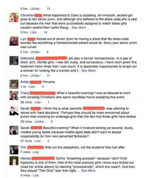 Since the incident, angry people from all over took to the Facebook page of the Richmond Homeschool Prom to express their disgust at the situation, and the administrators deleted all the comments. Now, it appears that they have deleted their page altogether. “The whole situation made me feel violated, walked over, and ostracized,” wrote Clare in a blog post.